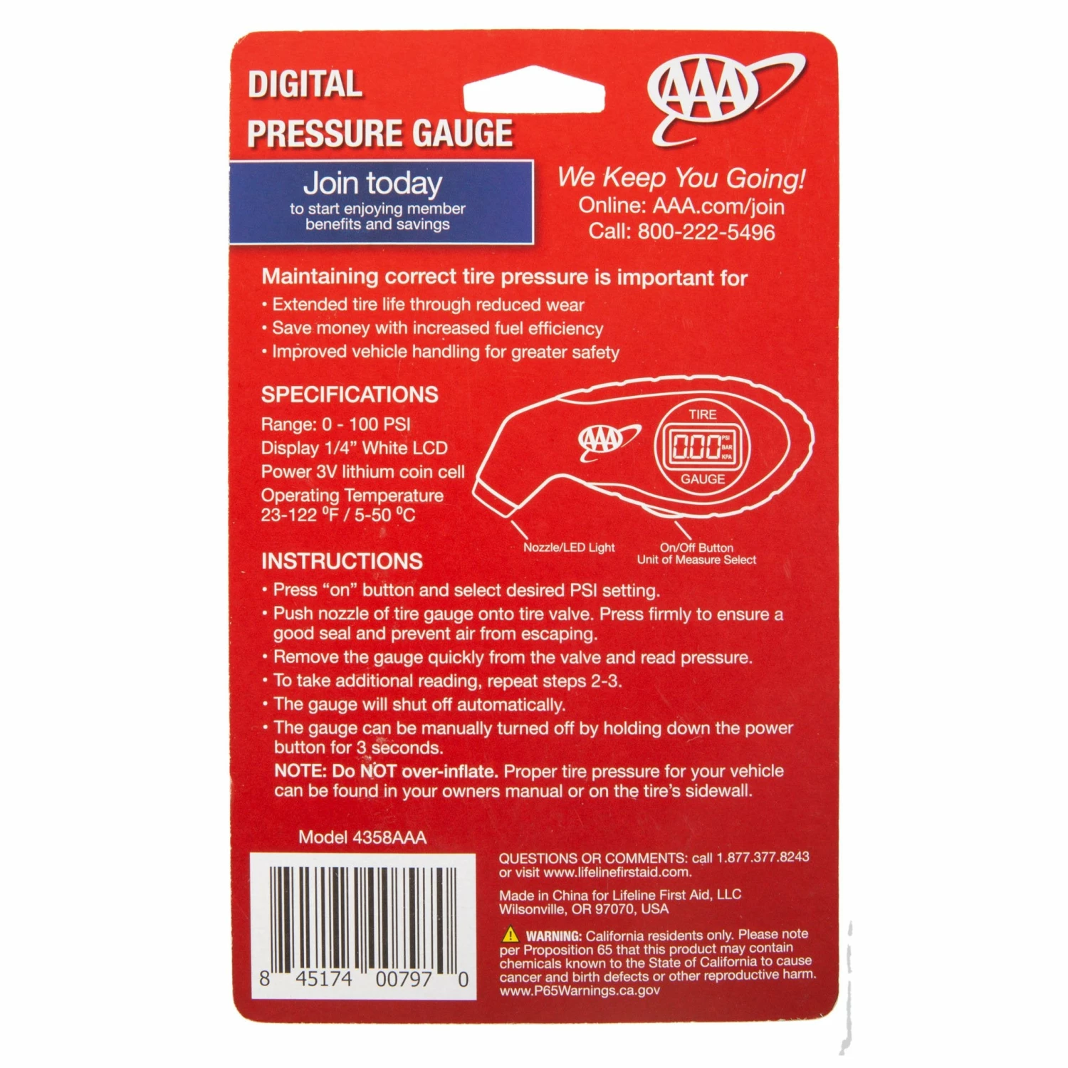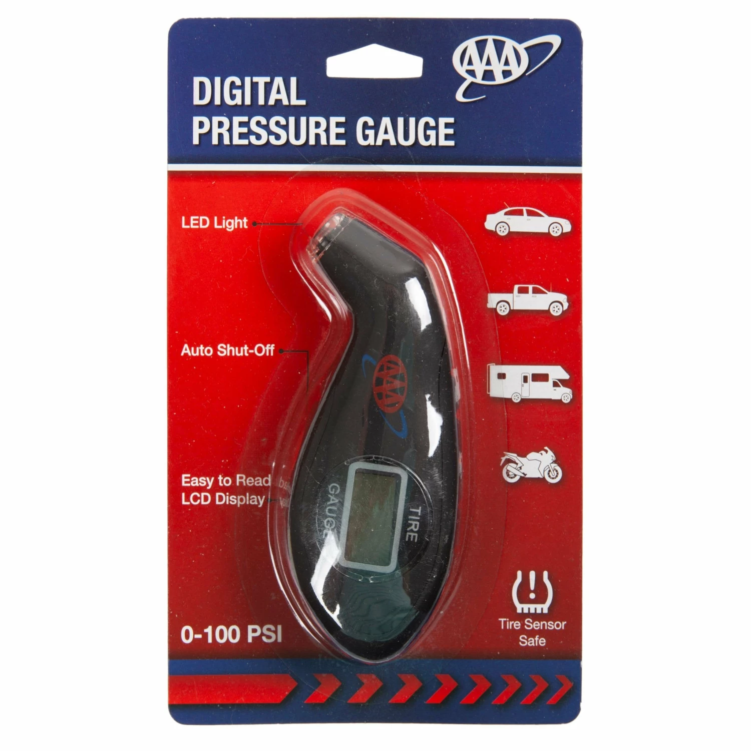 The AAA Digital Pressure Gauge comes backed by the best known name in the automotive industry, AAA. Unlike off the shelf pressure gauges, you know you are getting only the finest with AAA. This pressure gauge features an easy to read digital display with LED backlight and LED lit nozzle for visibility in dimly lit areas. This gauge reads pressure from 0 to 100 PSI with tire sensor safe. Or use the button to toggle between 4 measurement ranges. Gauge will auto shut off after 30 seconds, or press and hold the button for 3 seconds to turn off to save battery life. Compact size makes it perfect to throw in your glove box or tool box. Use with your car, truck, RV, Motorcycle and more.