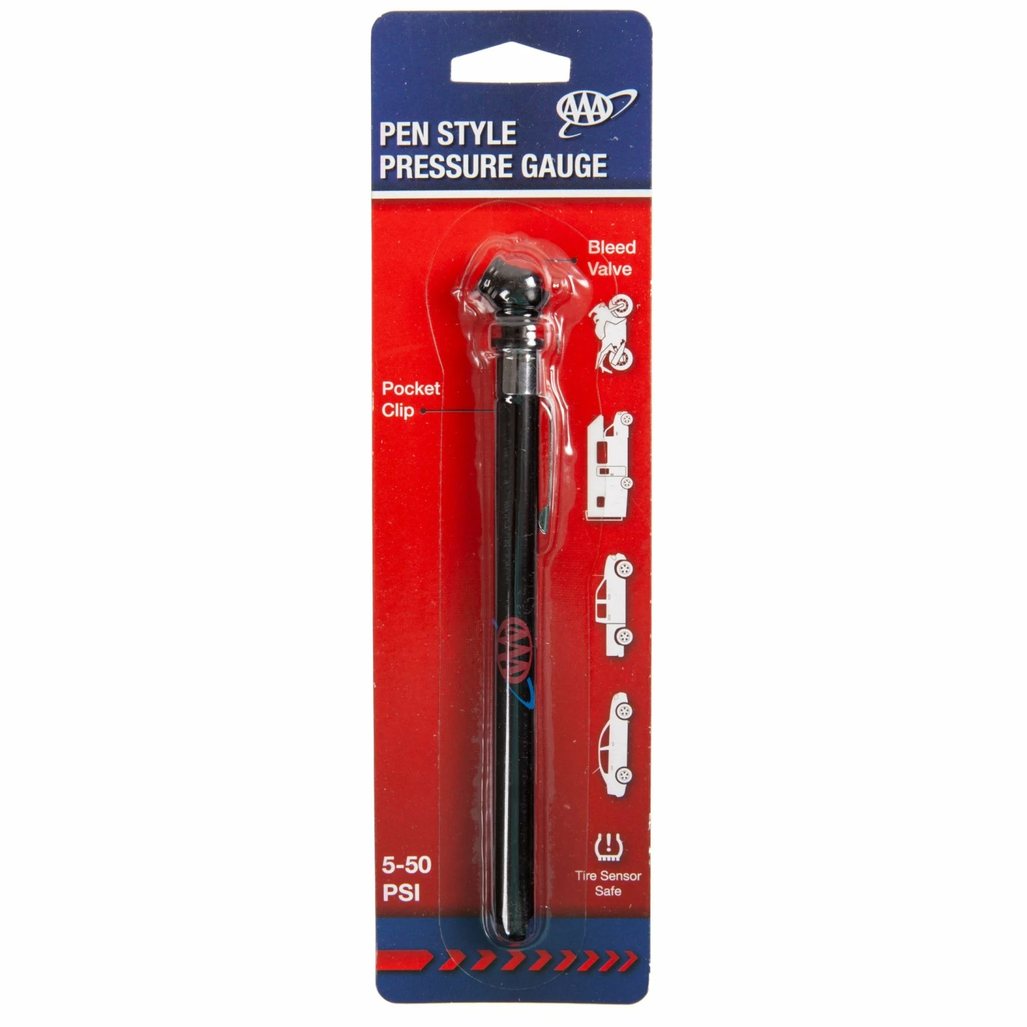 Small, compact size tire gauge easily stores in glove box, under seat, or in road safety kits. Reads pressures 0-50 PSI.