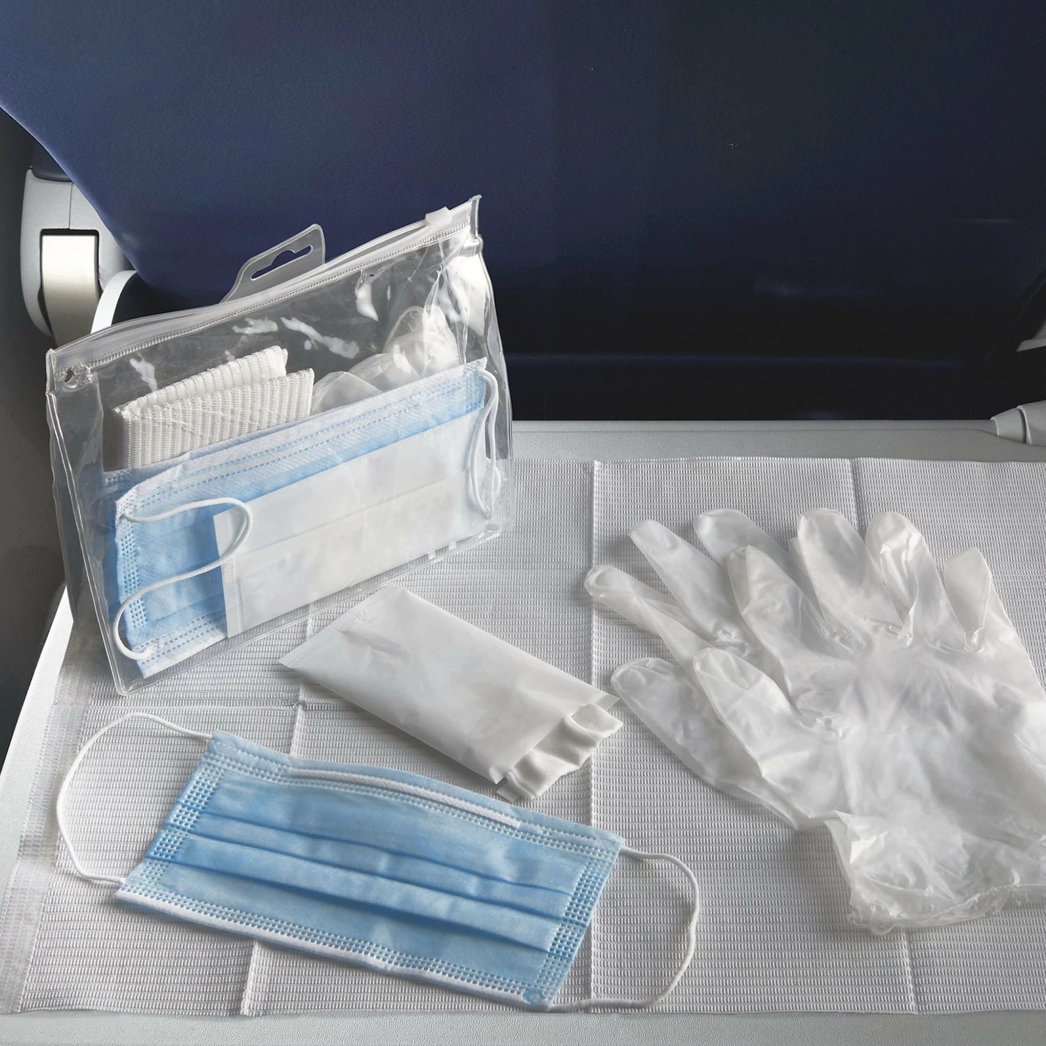 A personal protection kit that helps prevent exposure to germs and bacteria on flights to and from a destination with multiple legs. Includes an expanded assortment of gloves, masks, wipes, and headrest/tray liners. The clear vinyl quart-sized bag is reusable and meets 3-1-1 TSA carry-on requirements.