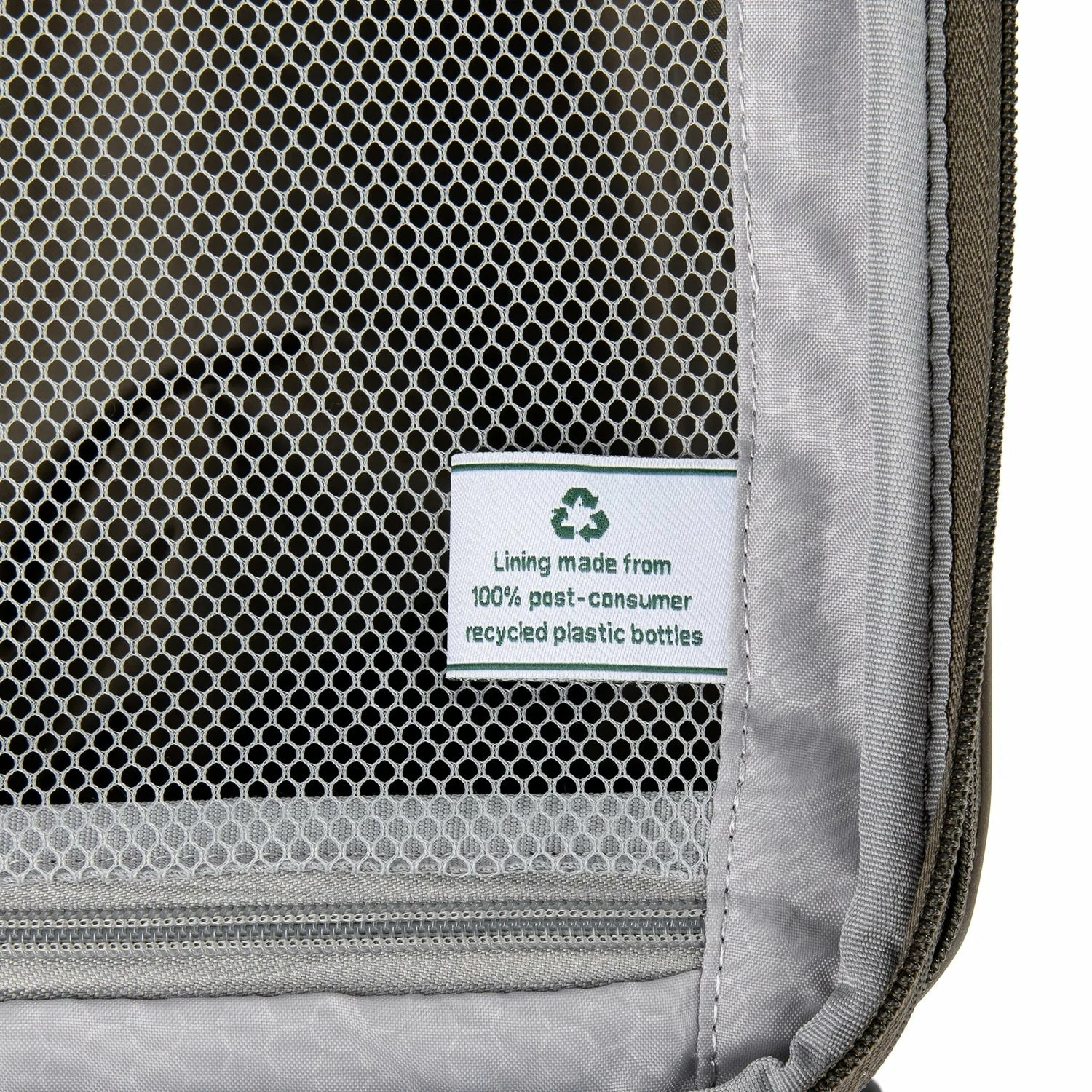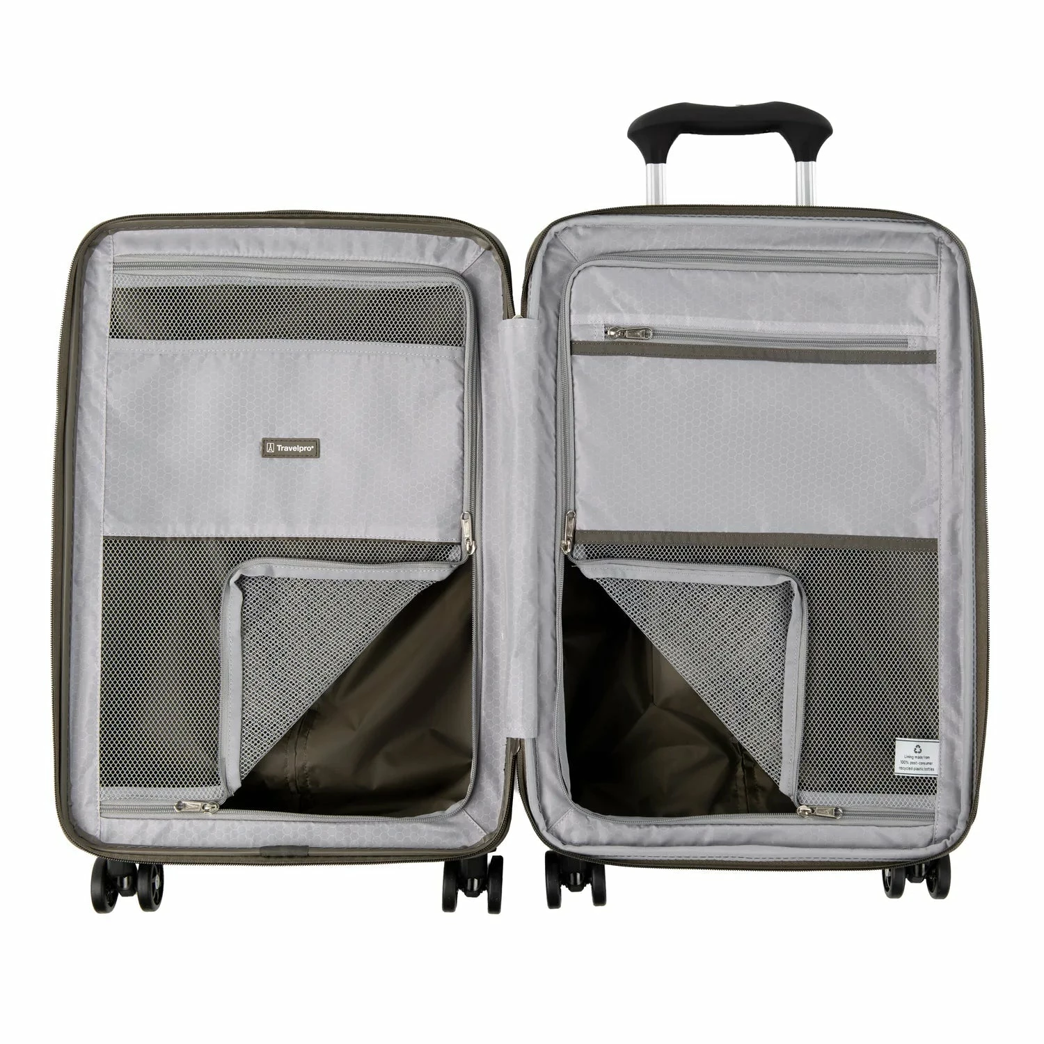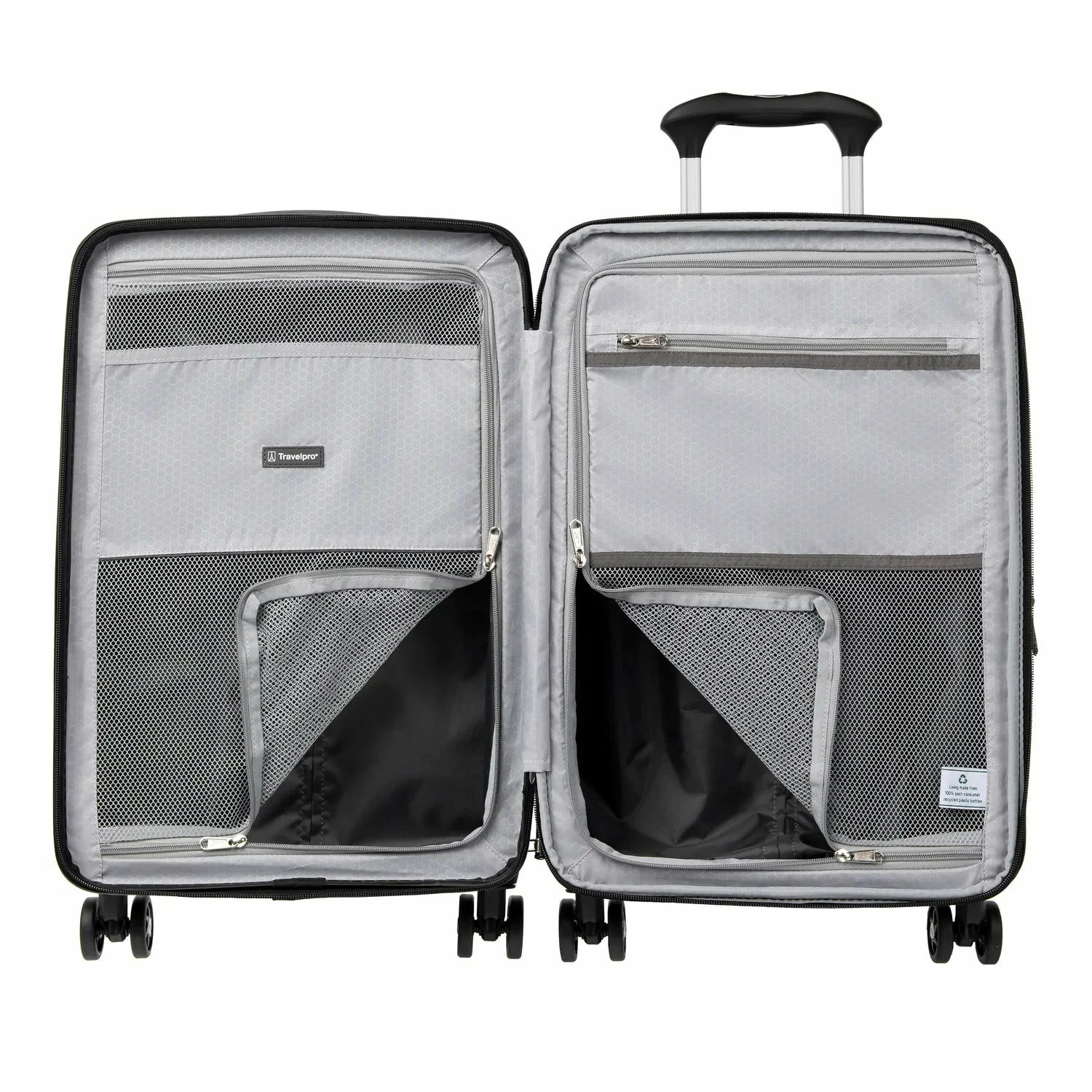 The interior lining of this carry-on is made from 100% post-consumer recycled plastic bottles to help reduce environmental waste and treated with H2O guard for moisture resistance. Two zippered interior divider panels and built-in accessory pocket keeps everything you pack organized, separated, and secure.