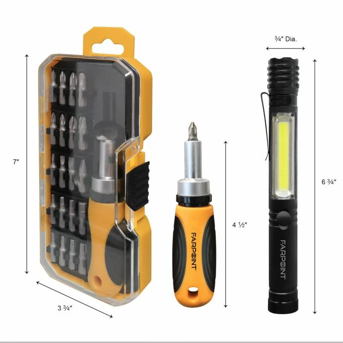 Perfect for home, outdoor, camping and emergency uses, this compact set will allow you to Do-It-All.ย The set includes a 300-lumen flashlight a handy 22 piece ratchet set and a 200-lumen Headlamp.