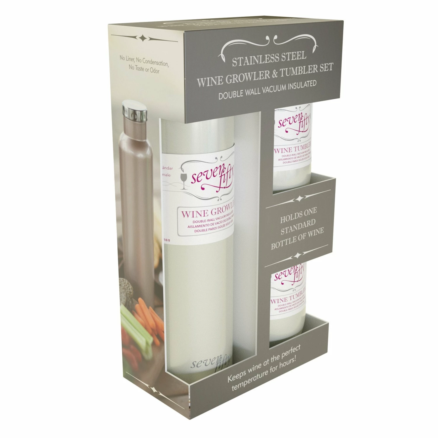 The SevenFifty Wine Gift Set is an ideal gift to give the guest of honor on their big day or that wine lover in your life. It includes one 750mL SevenFifty Wine Growler and two 350mL SevenFifty Wine Tumblers. Not only does the Gift Set have a sleek and elegant design the double-wall vacuum-insulated technology keeps your whites chilled and your reds at the perfect drinking temperature while preventing condensation on the outside of the product known as sweating. Each product includes a patented designed lid with a silicone ring that securely fits and is removable for easy cleaning.