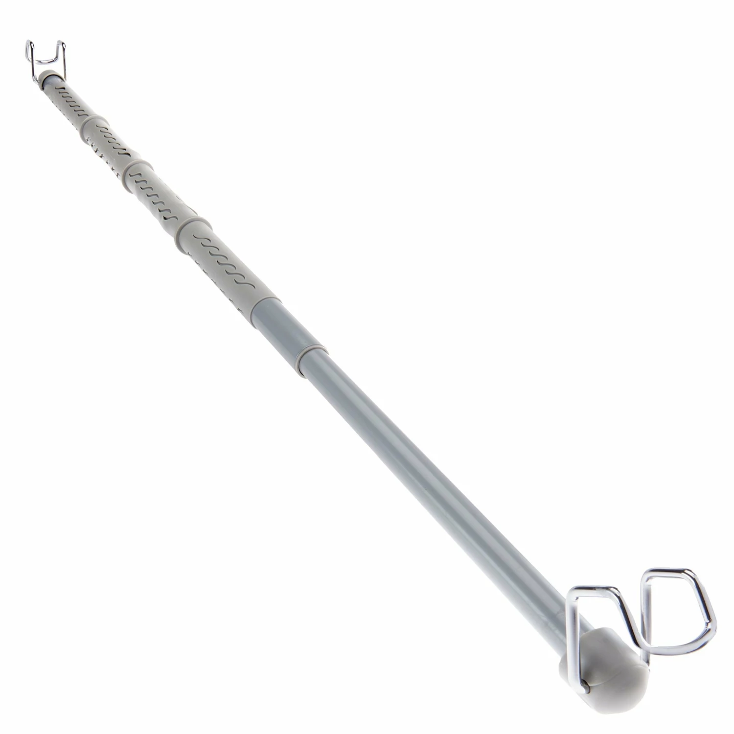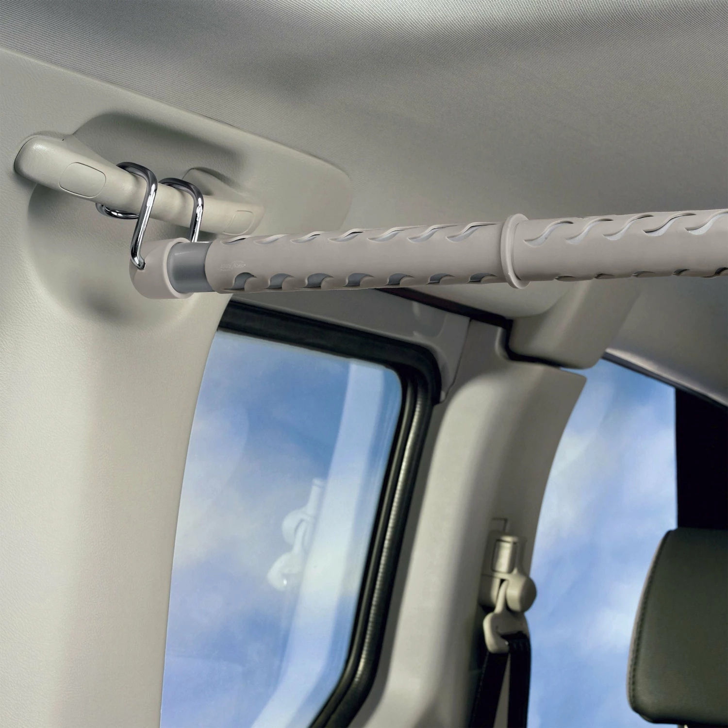 Heavy-duty, metal car clothes bar holds up to 30 lbs. and attaches 2 ways – position end hangers in the down position to hook over grab handles, or rotate upright to hang from ceiling hooks. Perfect for college students, moving, vacationers and cross-country road tours, it expands from 35″ to 59″ to fit most cars, and features adjustable grip sleeves and dividers to keep clothes from sliding, even on the tightest turns.