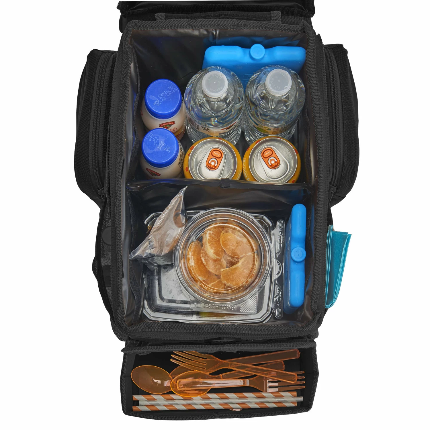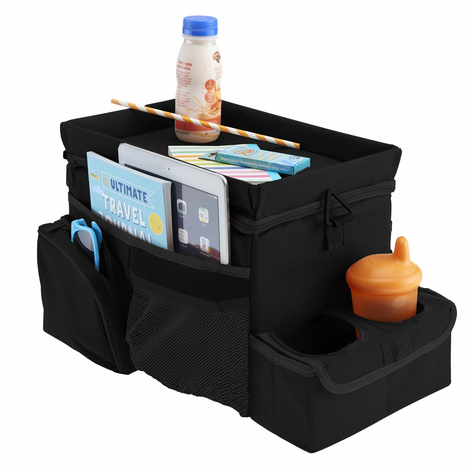 A complete car back seat kids entertainment organizer with 2 cup holders, an eating or play tray, an insulated cooler and 8 storage pockets that allow 2 passengers their very own storage. Also great for rideshare drivers and road trips.