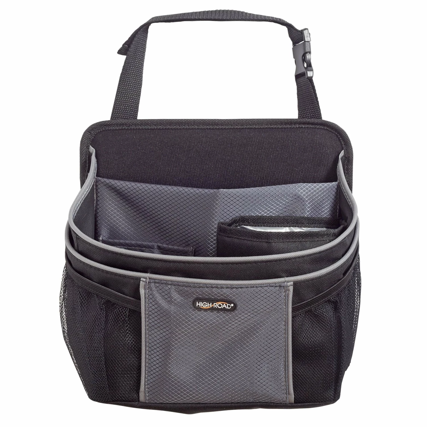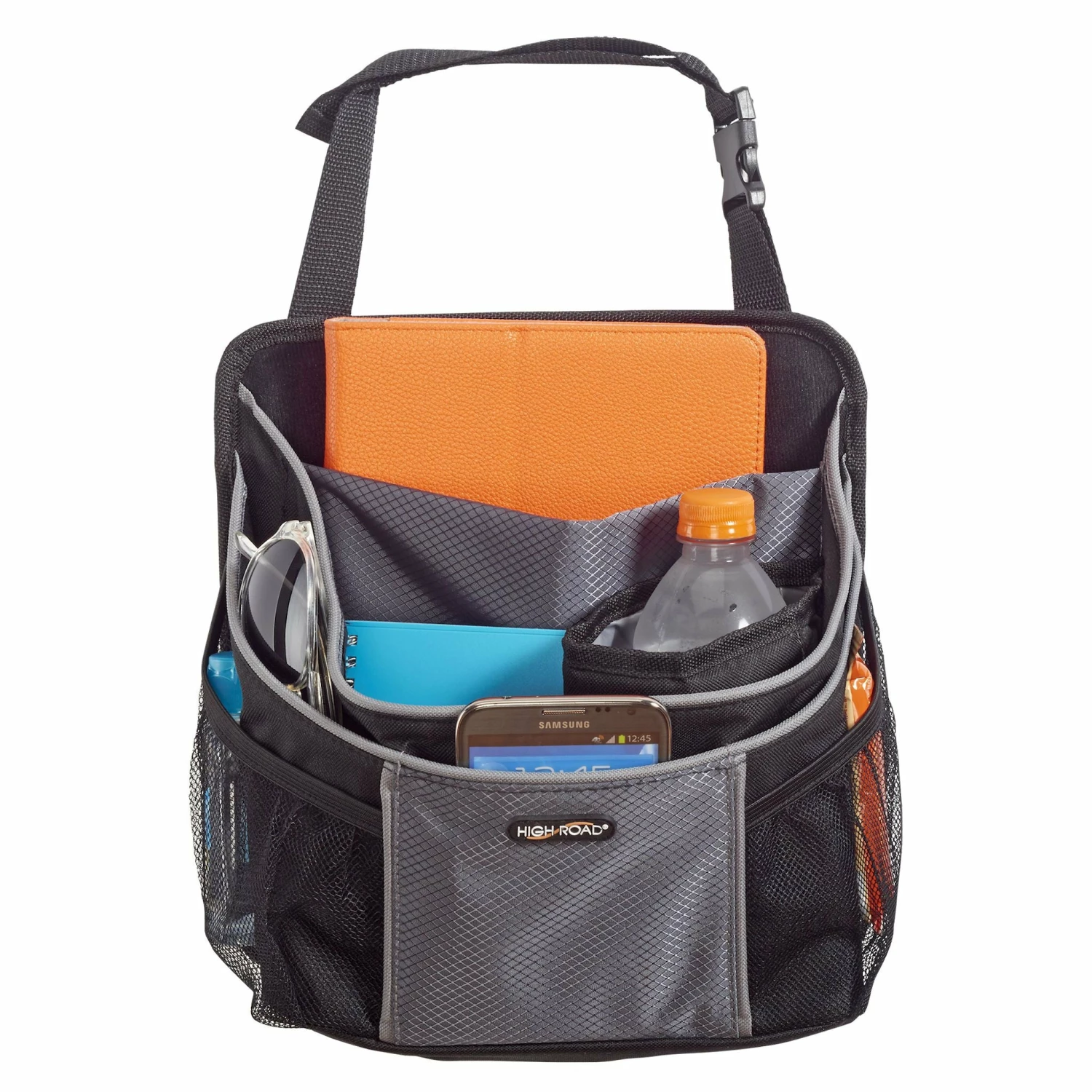 The easy way to de-clutter the daily commute, the DriverStash keeps important driving accessories within easy reach. An insulated beverage holder keeps bottles chilled and travel cups hot. The padded back compartment fits all sized tablets. 5 front pockets organize a cell phone, cords, snacks, sunglasses, tissues, sanitizer and more. An inside compartment has open storage space with 3 card pockets. Takes less than a minute to attach with a durable strap that can be adjusted higher or lower for best reach, and straps on the back make it simple to grab and swing to the back for passenger access. Patented.