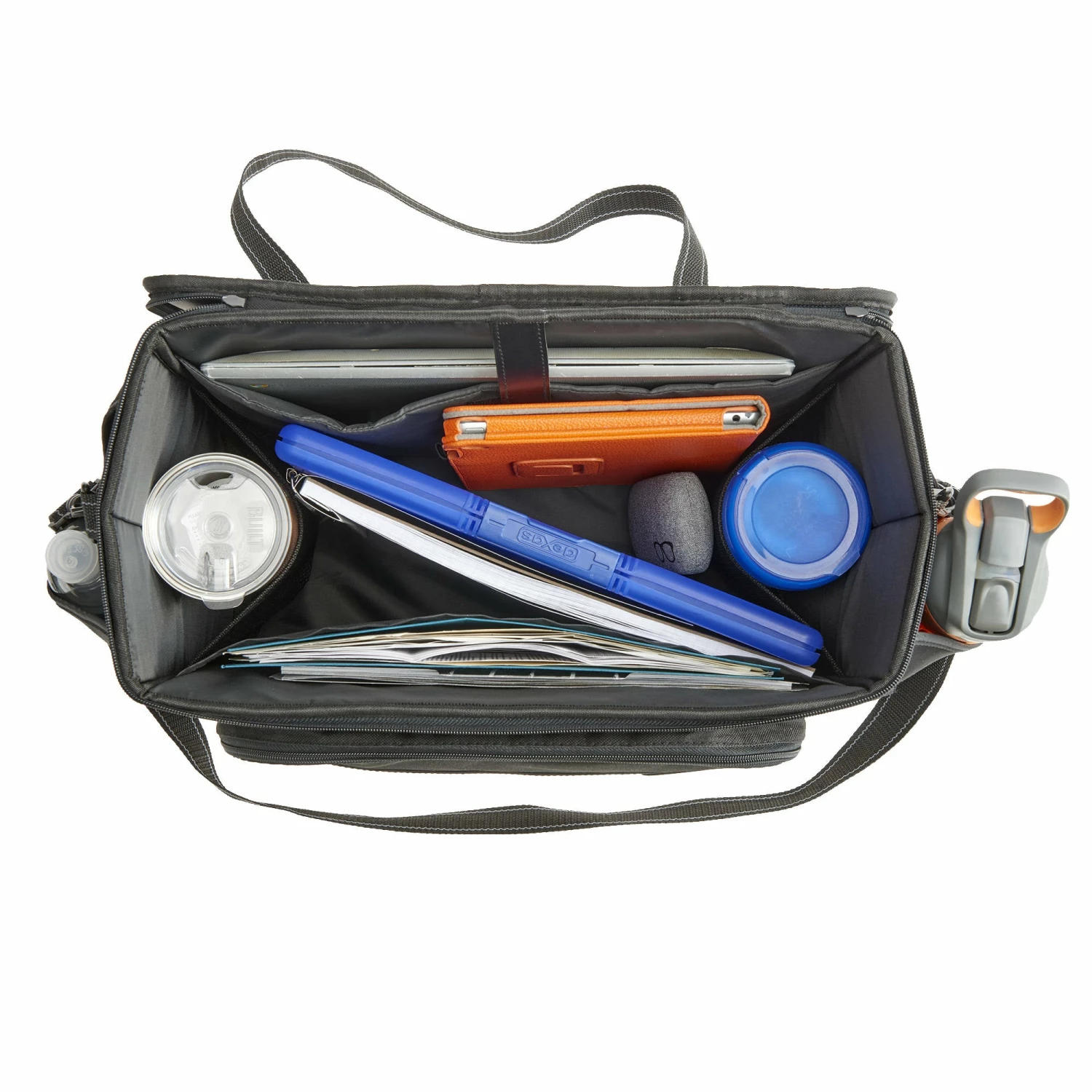 Organized office storage in and out of the car – this spacious work bag has a large inside compartment, outside desk organizer, insulating neoprene bottle holders and padded adjustable should strap – a computer bag and mobile office organizer all in one.