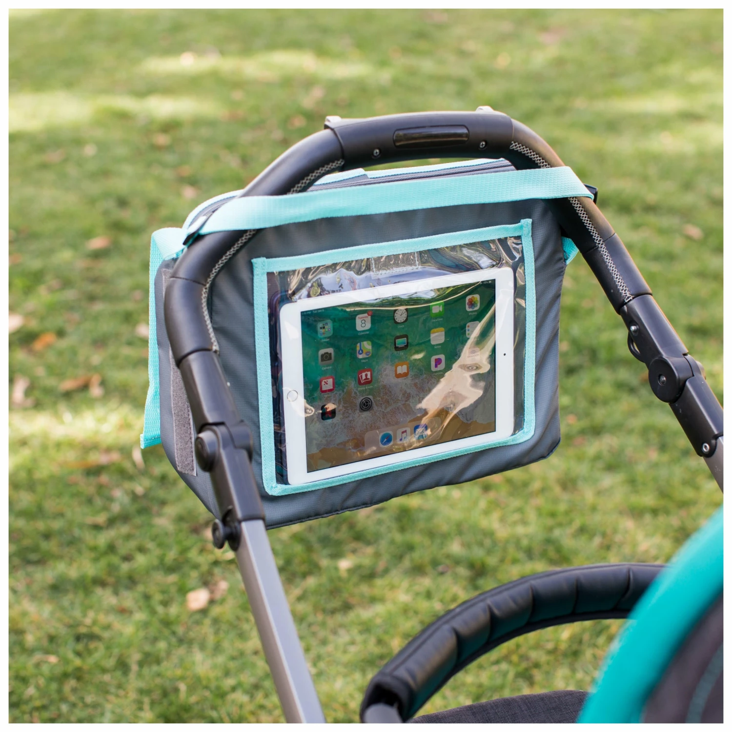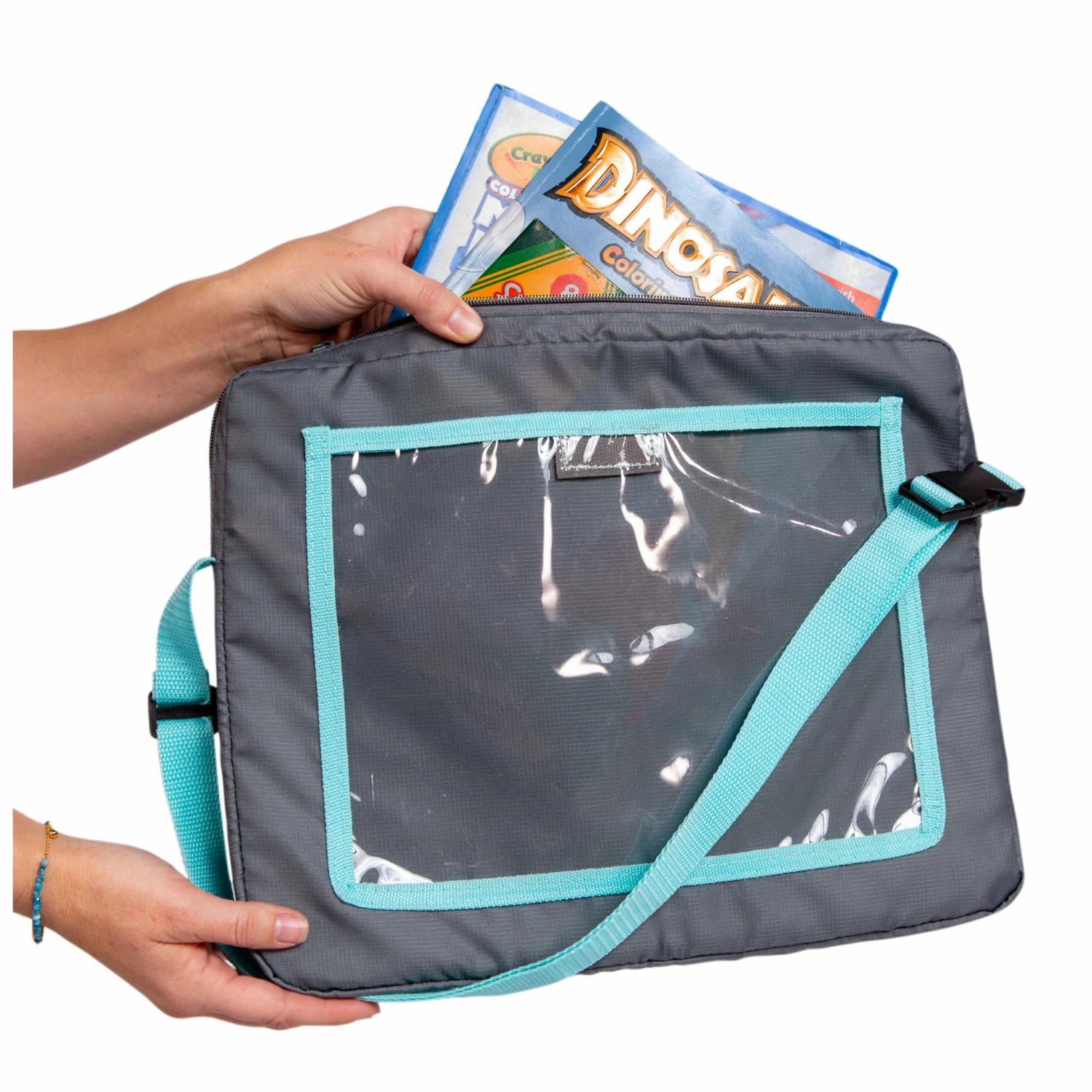 Turn the tray over and a full-size tablet holder will keep toddlers and kids peacefully entertained on road trips or any travel adventure. The tablet holder fits all sizes of iPads and tablets and can be used in the car, on an airplane or in a stroller. The tray can also be used as a travel tote bag! Toddlers and kids love carrying their own, special travel bag and the large zippered compartment in the travel tray holds their favorite coloring books, markers, toys and more. The shoulder strap is fully adjustable.