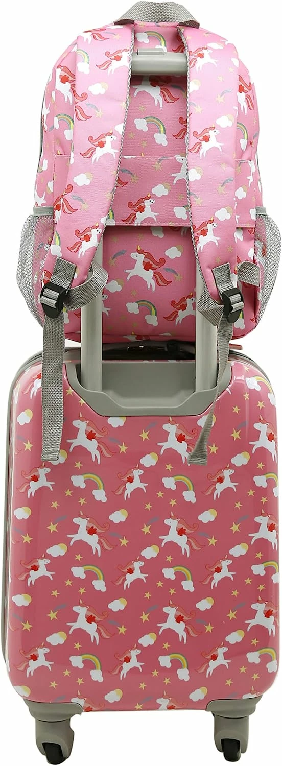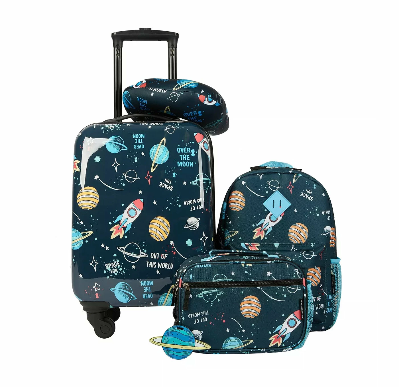 Travelers Club Kid’s 5-Piece Luggage set is perfect for a short weekend trip, daycare, school and much more. The set includes an 18″ Hardside Carry-On that includes spinner wheels, a 15″ backpack, a 10″ lunchbag, a neck pillow, and a luggage tag. Each piece has the fun, playful print that your child will love. All pieces are the perfect size for any child.
