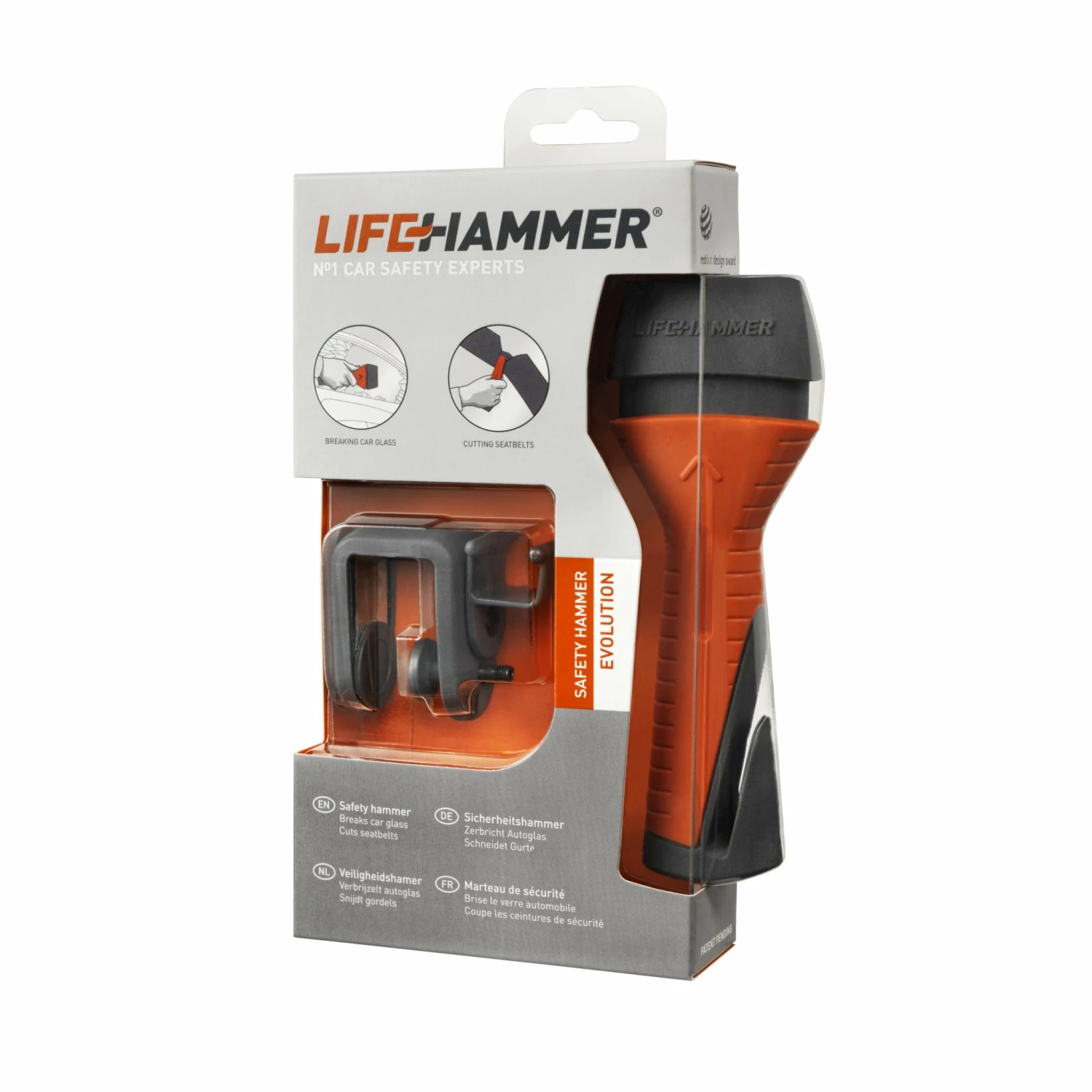 The Safety Hammer Evolution by Lifehammer can quickly and efficiently aid you in escaping from a disabled vehicle in the event of an emergency. The spring-loaded head breaks glass while the integrated seatbelt slicing blade safely cuts away stuck seatbelts. It features a conical handle with a non-slip grip and can be mounted in nearly any position using the including Quick Click System.