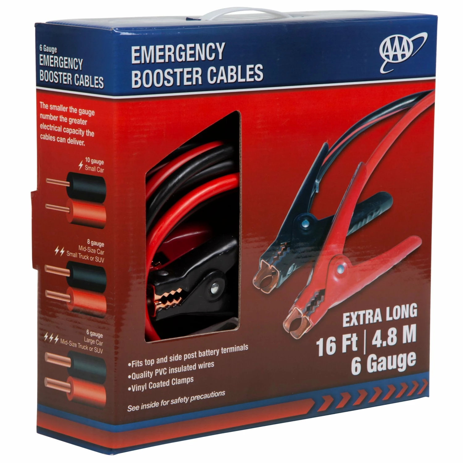 The 4326AAA booster cables comes backed by the best known name in the automotive industry, AAA. Unlike off the shelf cables, you know you are getting only the finest with AAA. With jumpstarting a car its key to remember; the smaller the gauge number the greater electrical capacity a cable can deliver, our thick 6 gauge wire gives you more power when charging a battery in need of a jump start. These 16ft / 4.8M length cables gives you the right length wire to ensure that you are able to easily reach the battery of another vehicle when attempting to jump it. The clamps on these booster cables are the perfect size to fit the top and side post battery terminals to making jumping your car quick and easy, every time you need to jump a car. Our cables feature quality 6 gauge wire with insulated wires are ideal for jumping a large car, midsize truck or SUV, and can also jump things like motorcycles, ATVโs