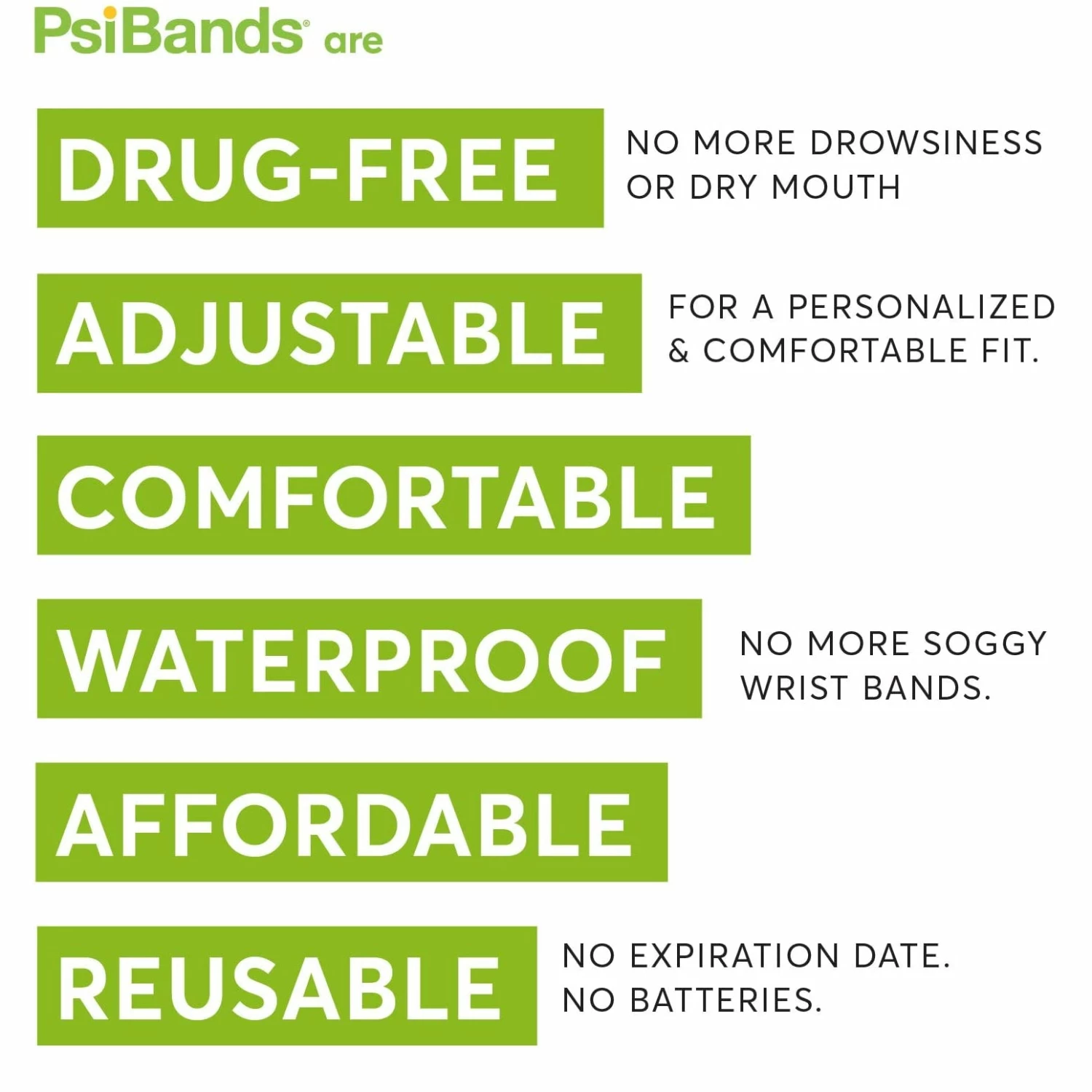 Psi Bands are waterproof and can be worn when showering, snorkeling, sailing, washing dishes, and swimming without getting soggy. They are a safe, natural option without the side effects of drowsiness or dry mouth caused by over-the-counter medications.