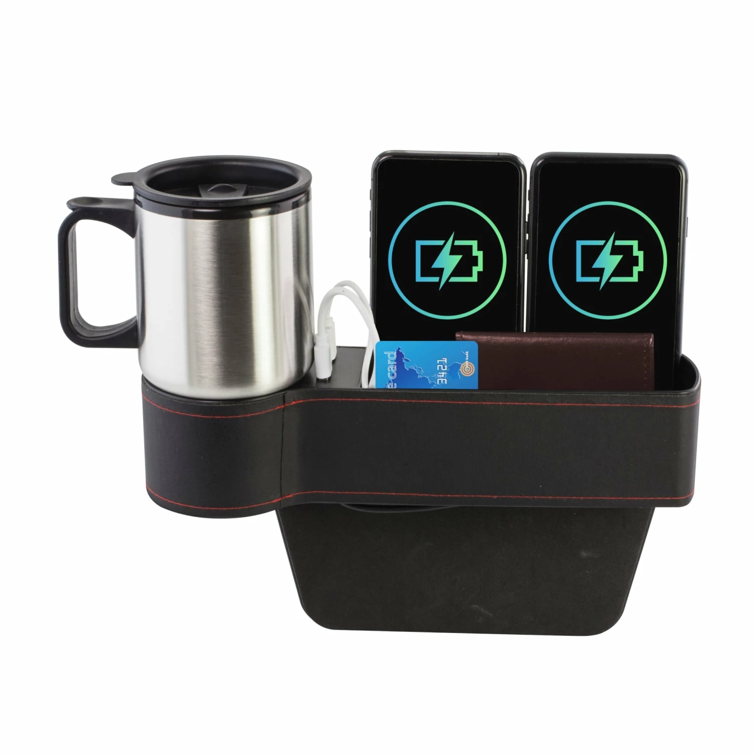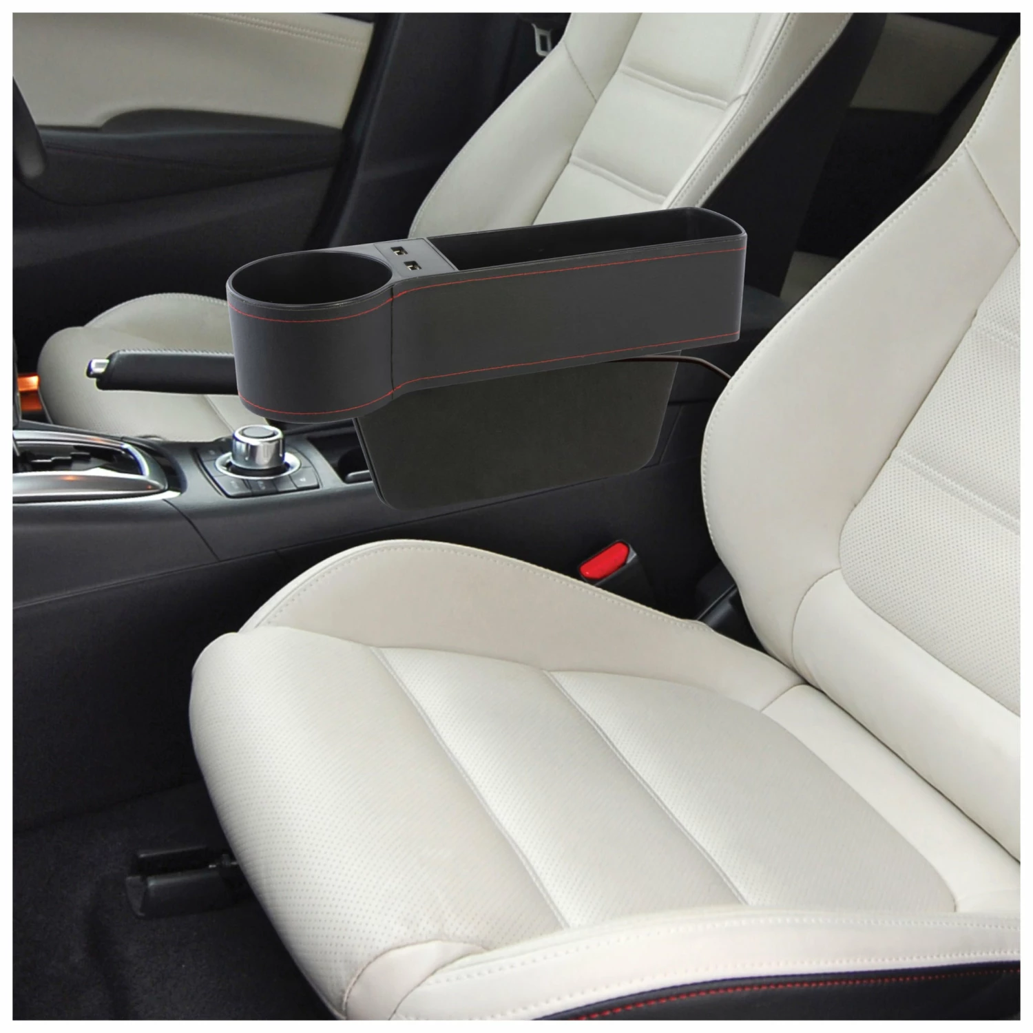 This organizer easily fits between the driver’s seat and the center console to provide additional storage. The organizer includes a cup holder, dual USB charging ports, storage for your smart phone and a slot for credit cards. The organizer has a 31″ cord that plugs into your 12V lighter for power. Plastic and stainless steel. 10Β½”L x 3″W x 2ΒΌ”H.