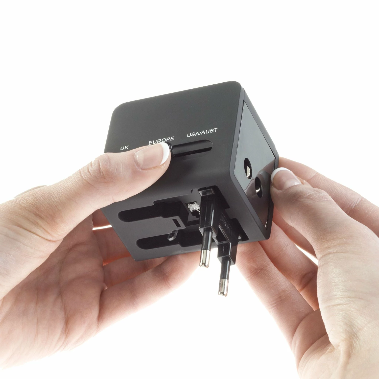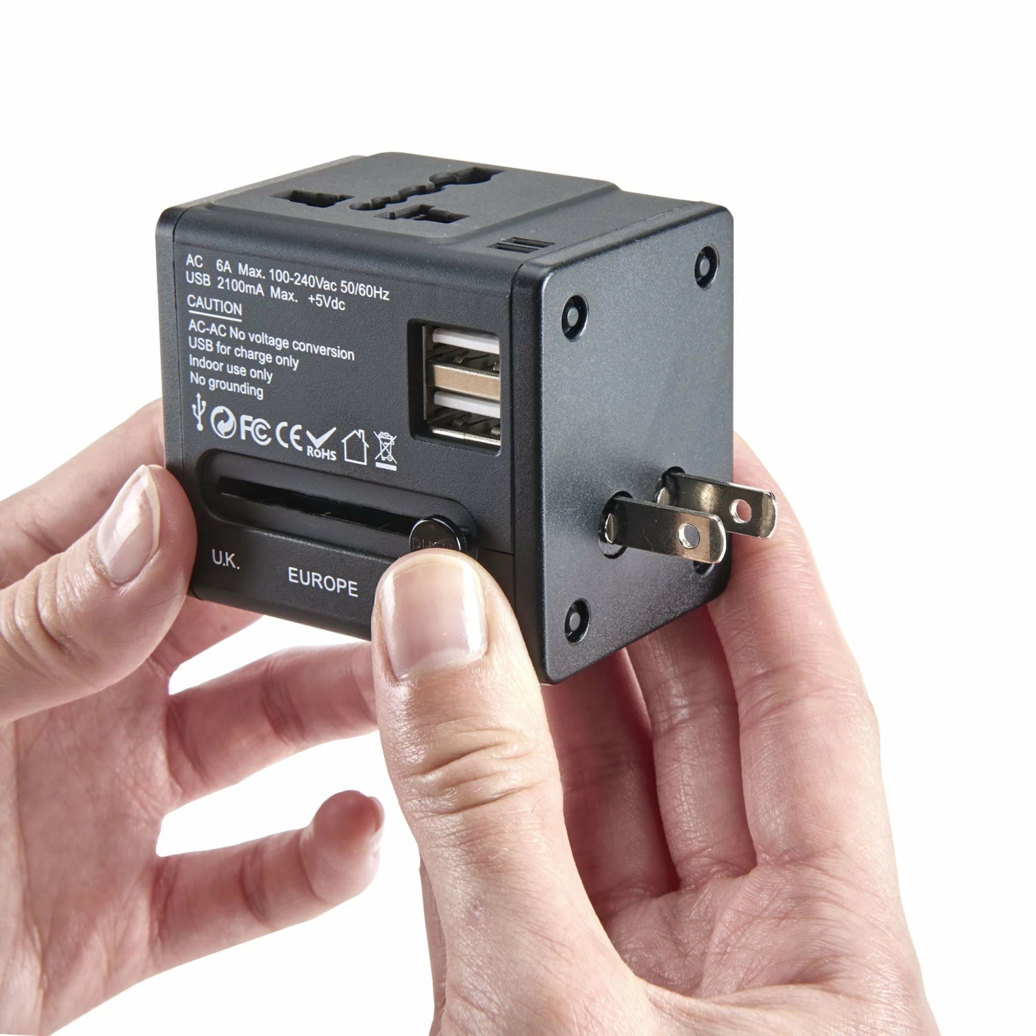 An easy to pack cube with dual 2.1A USB ports and integrated global adapter plugs for use in most worldwide locations.