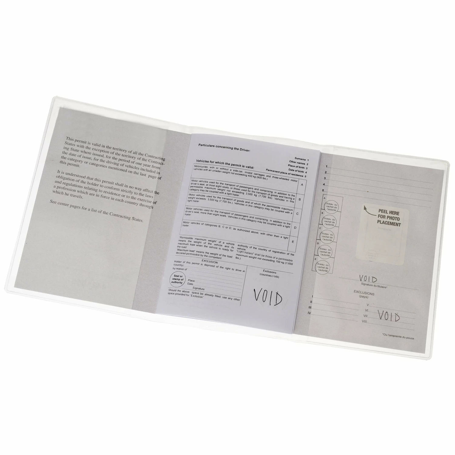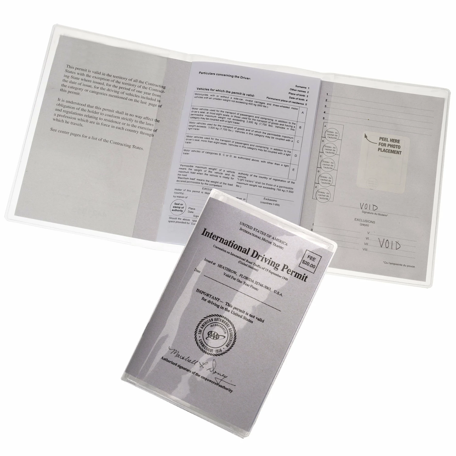 Triple-fold, clear vinyl cover protects international driving permits from rips, stains and moisture.