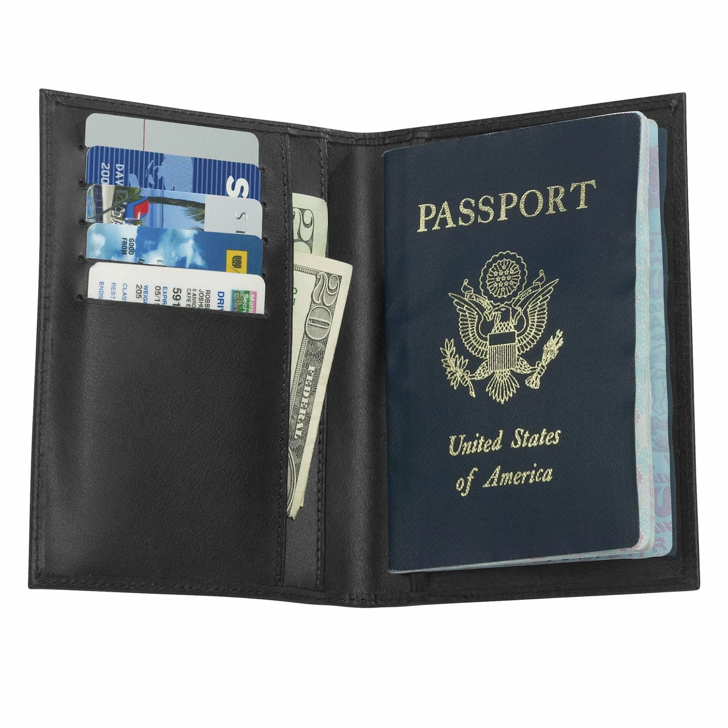 Protects personal information contained in credit card chips and passports. Lined with RFID material to block scanner transmissions of personal data. Features 5 credit card pockets and 3 document pockets. Made from pebble-grained faux leather.