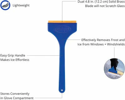 The Snow Joeยฎ Edge ice scraper with brass blade is a must-have for winter survival. This handy winter tool features a durable 4.8-inch brass blade that effectively cuts through frost and ice on car windows and windshields in just one swipe. And, since brass is softer than glass, youโll easily scrape through light or heavy frost or icy frozen mixes without leaving a scratch. Inefficient plastic scrapers require multiple passes and still donโt get the job done. But, with the Snow Joeยฎ Edge, youโll make quick work out of any ice that gets in your way. Its comfort grip handle makes it easy to use and itโs compact enough to fit neatly inside your glove compartment. Stay at the cutting edge this winter with the Snow Joeยฎ Edgeโyour reliable winter tool for any ice or frost emergency.