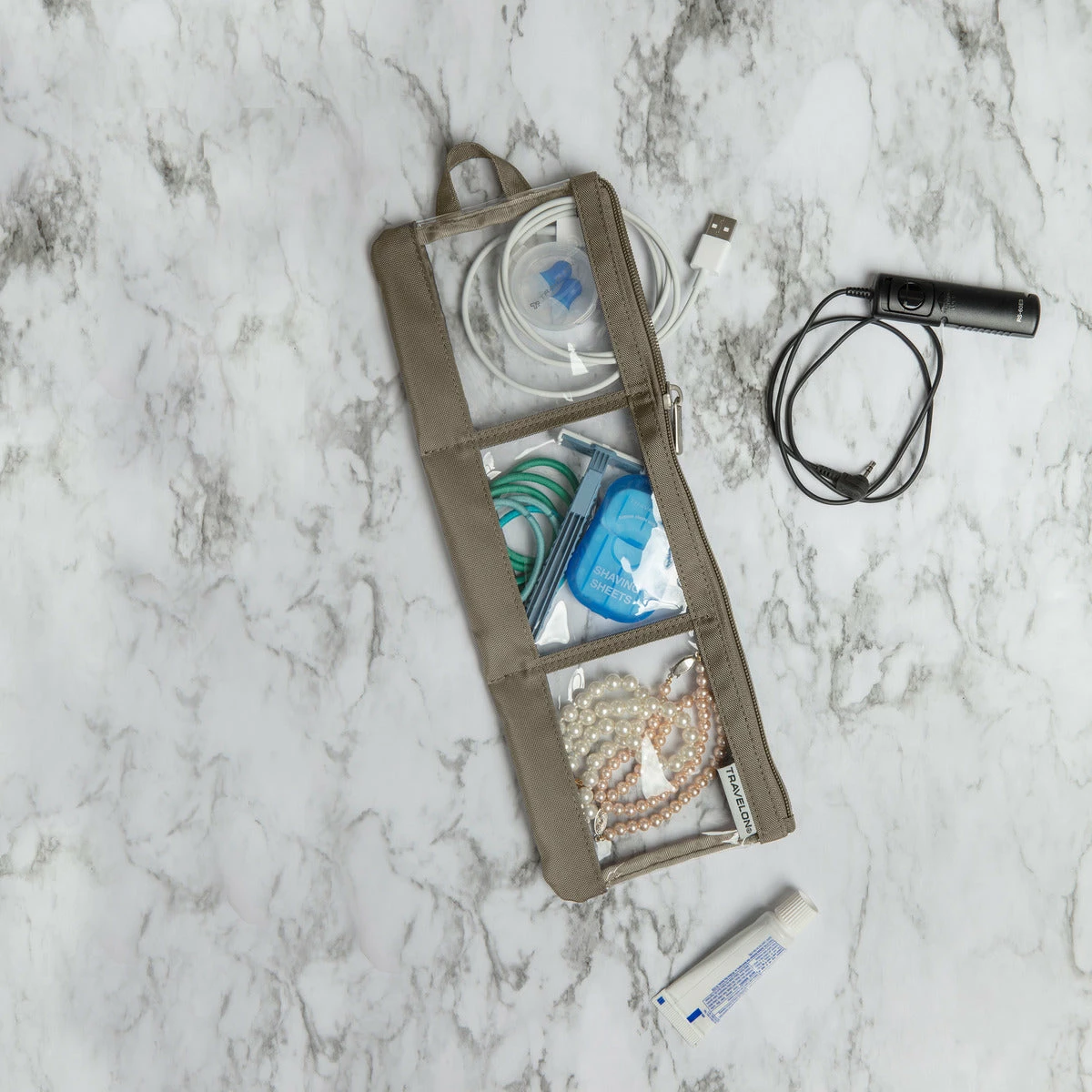 The definition of practical good looks, our Accessory Organizer Pouches helps you stay organized when you’re on the road. With three separated compartments and dimensions are just right for cosmetics, accessories, earbuds, cords – all the essentials you need to make it through the day in style – and the clarity of the bag allows for easy identification of everything!