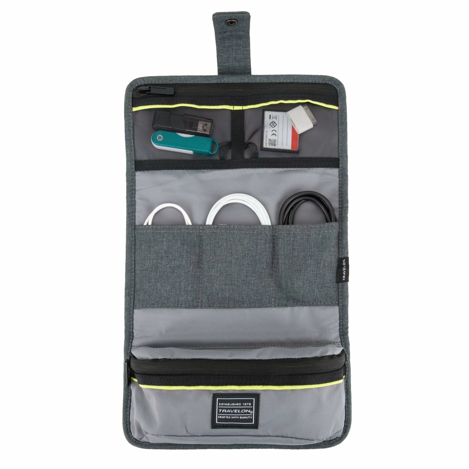 Say goodbye to tangled cords – Want to finally feel more organized? That’s what this travel cord and tech accessory organizer is for. It’s the perfect place to keep all your gear in one spot. No more digging through the abyss that is your bag! The Travelon Deluxe Tech Accessory Organizer is made from durable polyester. It folds up into a slim shape that makes it efficient use of space in any tote bag, briefcase, backpack, or travel bag.