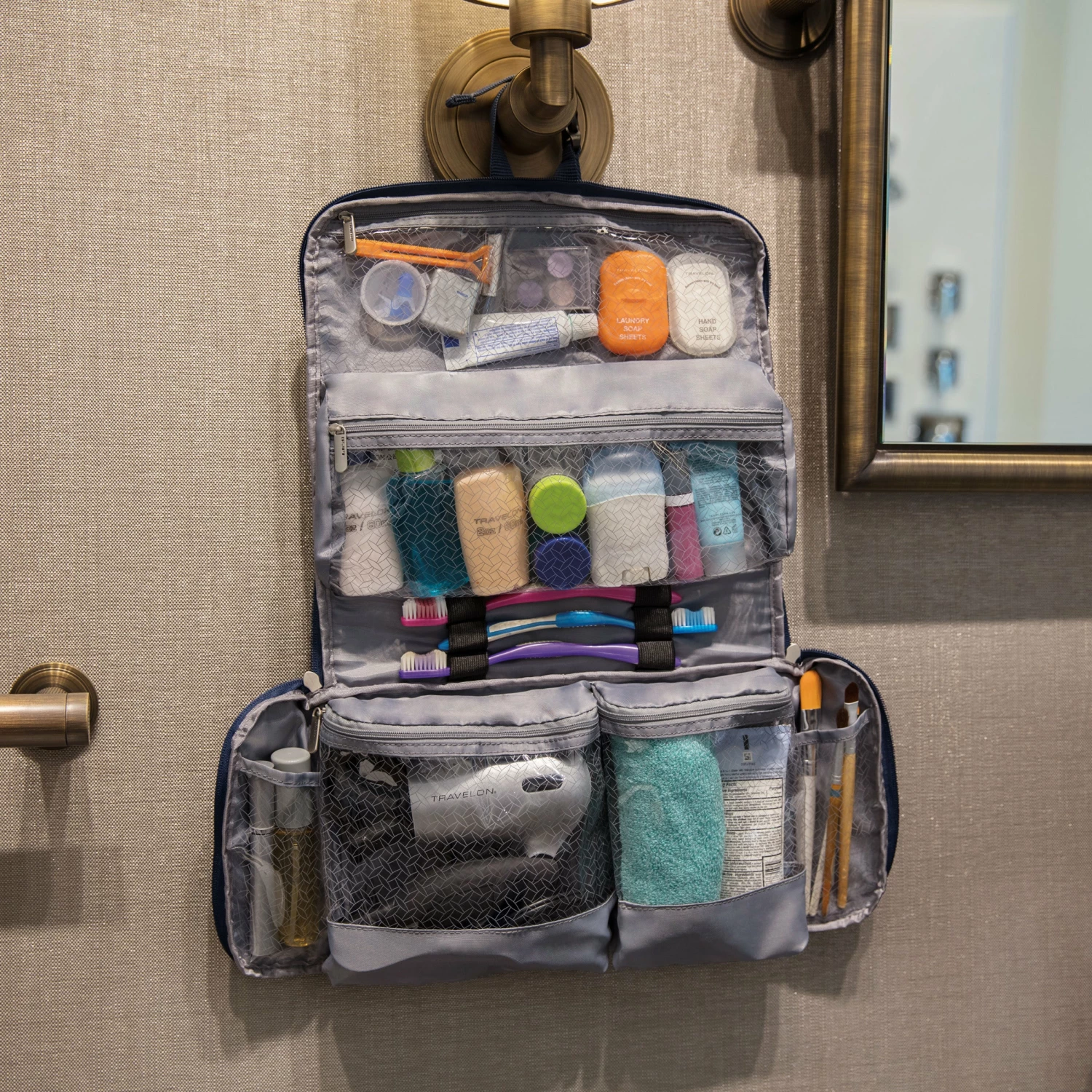 The Flat-Out Hanging Toiletry Kit makes a great choice when packing for business trips, summer vacations, or out-of-town family holidays, dorm rooms or simply heading to the gym. When you get to your destination, simply hang the kit on a hook or the back of the door. The slim toiletry kit offers ample space, yet lays flat in a suitcase β taking up about the same amount of space as a pair of jeans. Perfect for saving space when you travel.